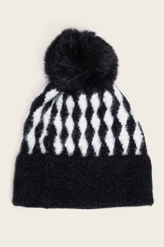 Make a bold style statement with this Abstract Diamond Knit Pom Pom Beanie. Featuring a striking diamond stripe knit pattern topped with a fluffy pom pom, this versatile piece transforms any outfit into an instant fashion moment. Crafted from 100% acrylic for cozy comfort, it's the perfect accessory for adding personality to your everyday look.