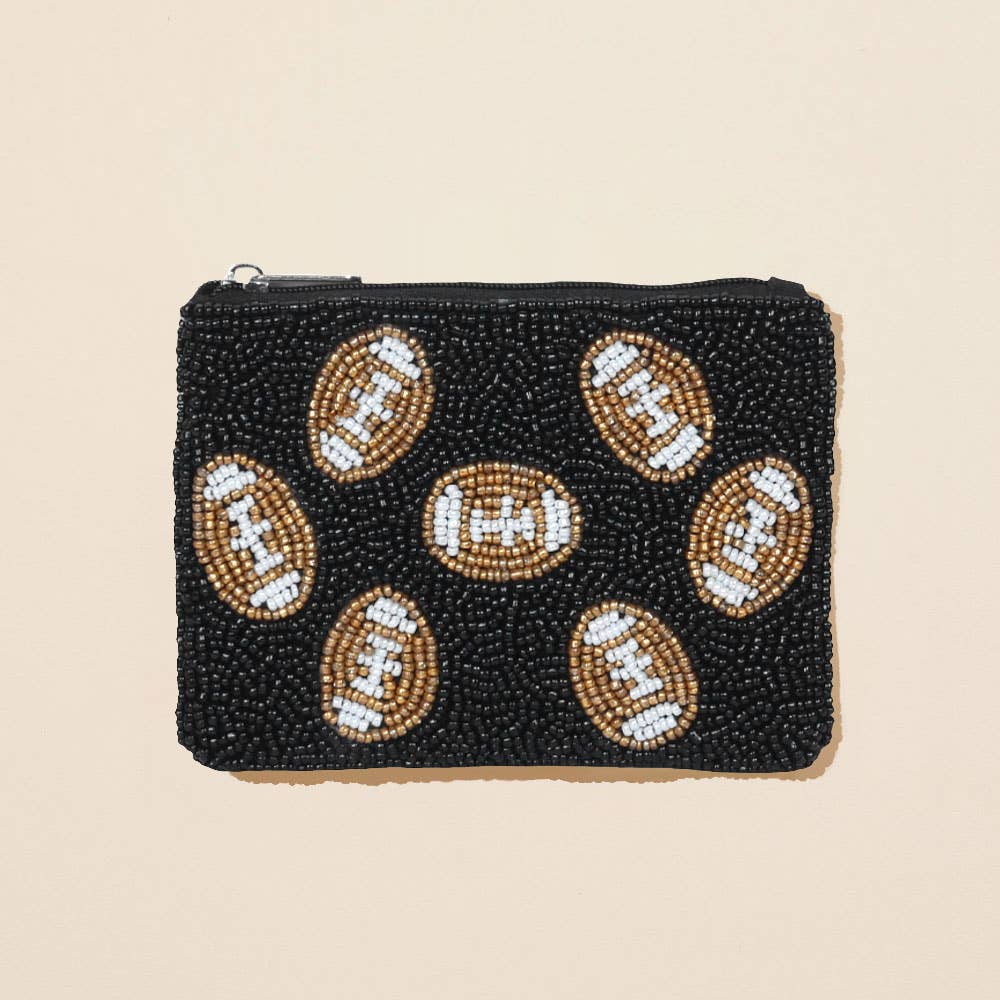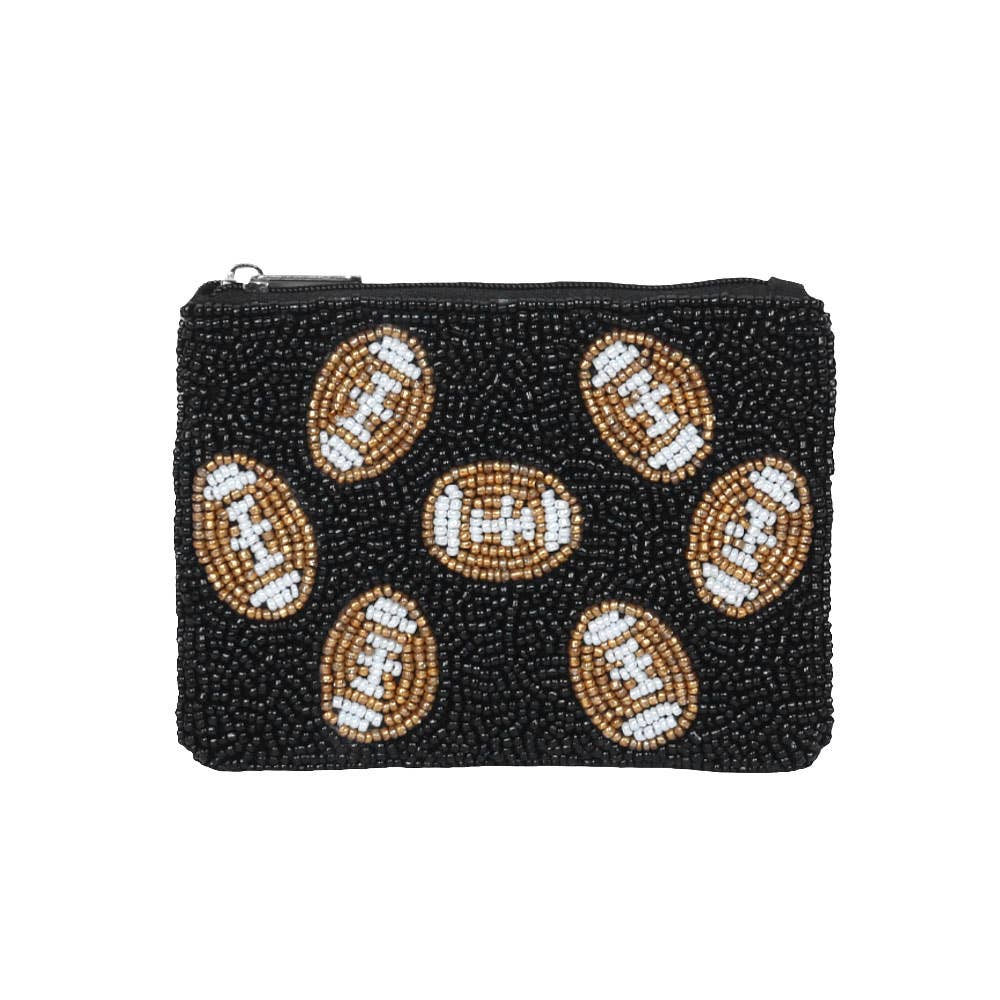 Tote your essentials in style with this adorable seed-beaded mini pouch, sized at 5" X 3.75". Featuring a vibrant football pattern on the front, this zippered pouch is perfect for stashing cards, cash, and small treasures while celebrating your team pride. With beadwork on the front and a secure zipper closure, it's both functional and fun—ideal for game day or everyday carry. Made in India.