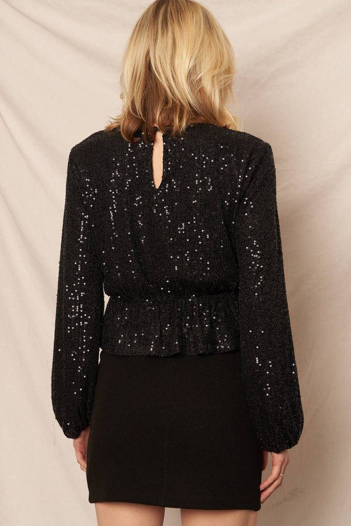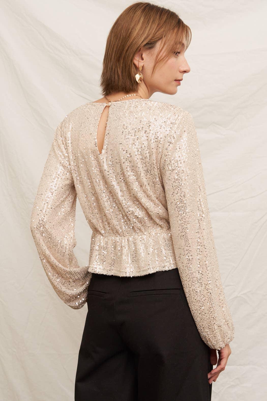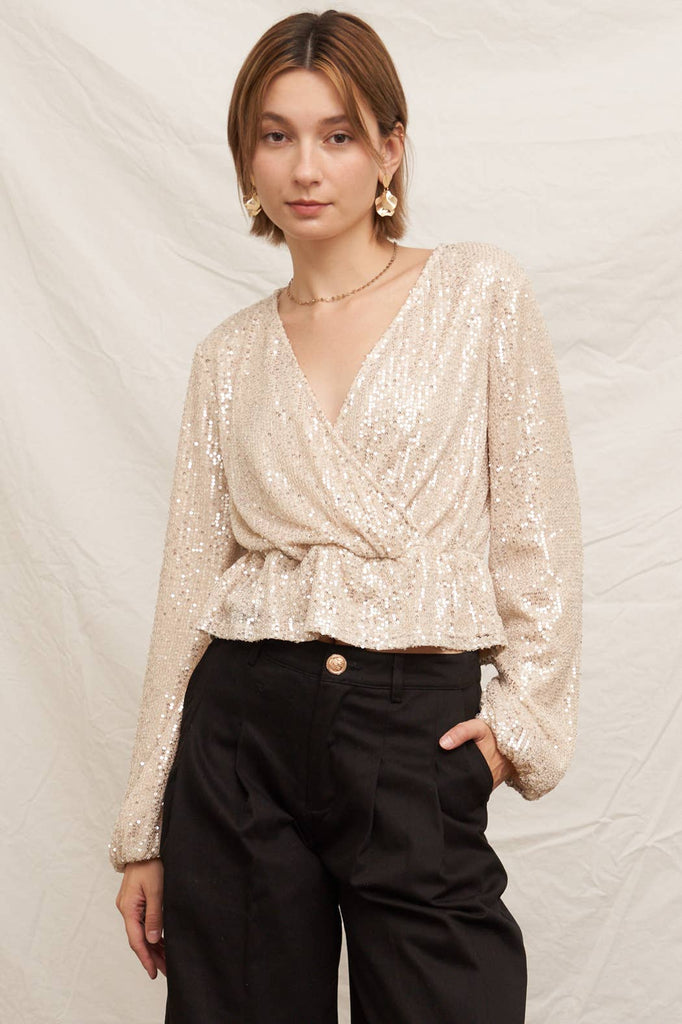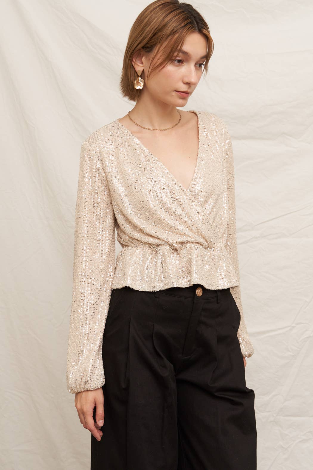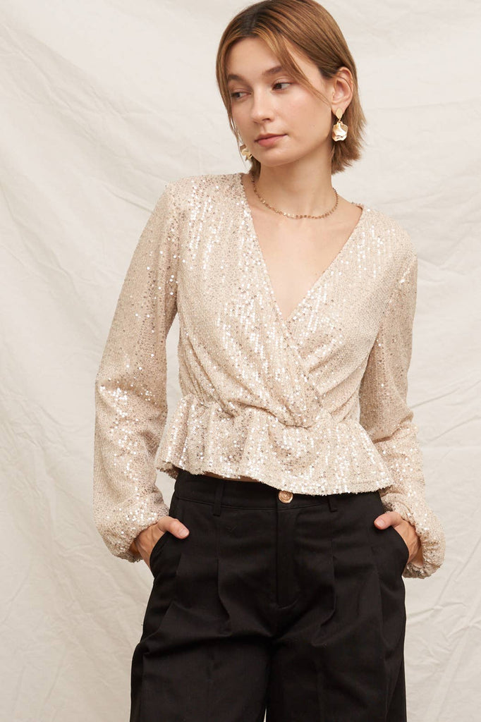 Elevate your evening look with this show-stopping long sleeve peplum sequin top! Crafted from 100% polyester, this piece features shimmering sequins that catch the light beautifully, paired with a flattering peplum silhouette that adds dimension and movement. The long sleeves offer coverage while maintaining that glamorous vibe perfect for nights out or special occasions.