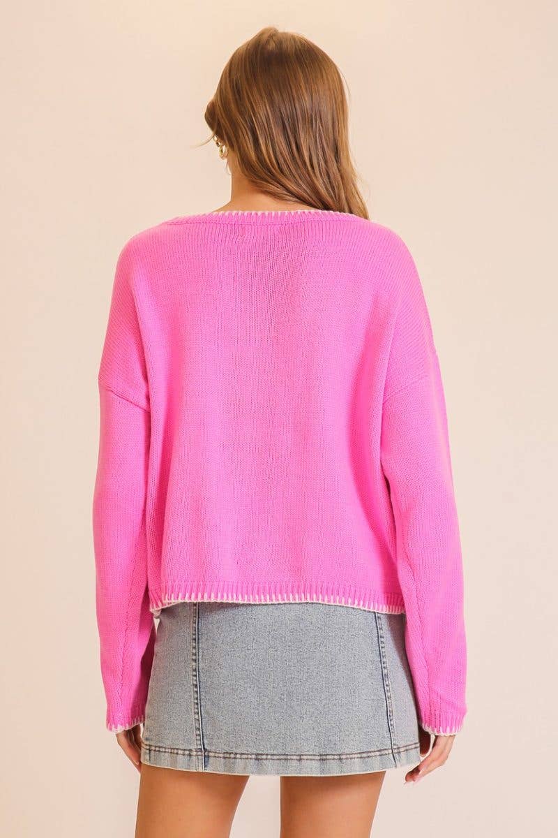 Bring joy to your winter wardrobe with this festive "MERRY" intarsia knit sweater. Designed for comfort and cheer, this standout piece features bold lettering across the front and charming contrast whipstitch detailing along the neckline, cuffs, and hem. The relaxed silhouette and soft knit fabric make it a cozy yet statement-making addition-perfect for holiday parties, casual gatherings, or spreading seasonal spirit all season long.