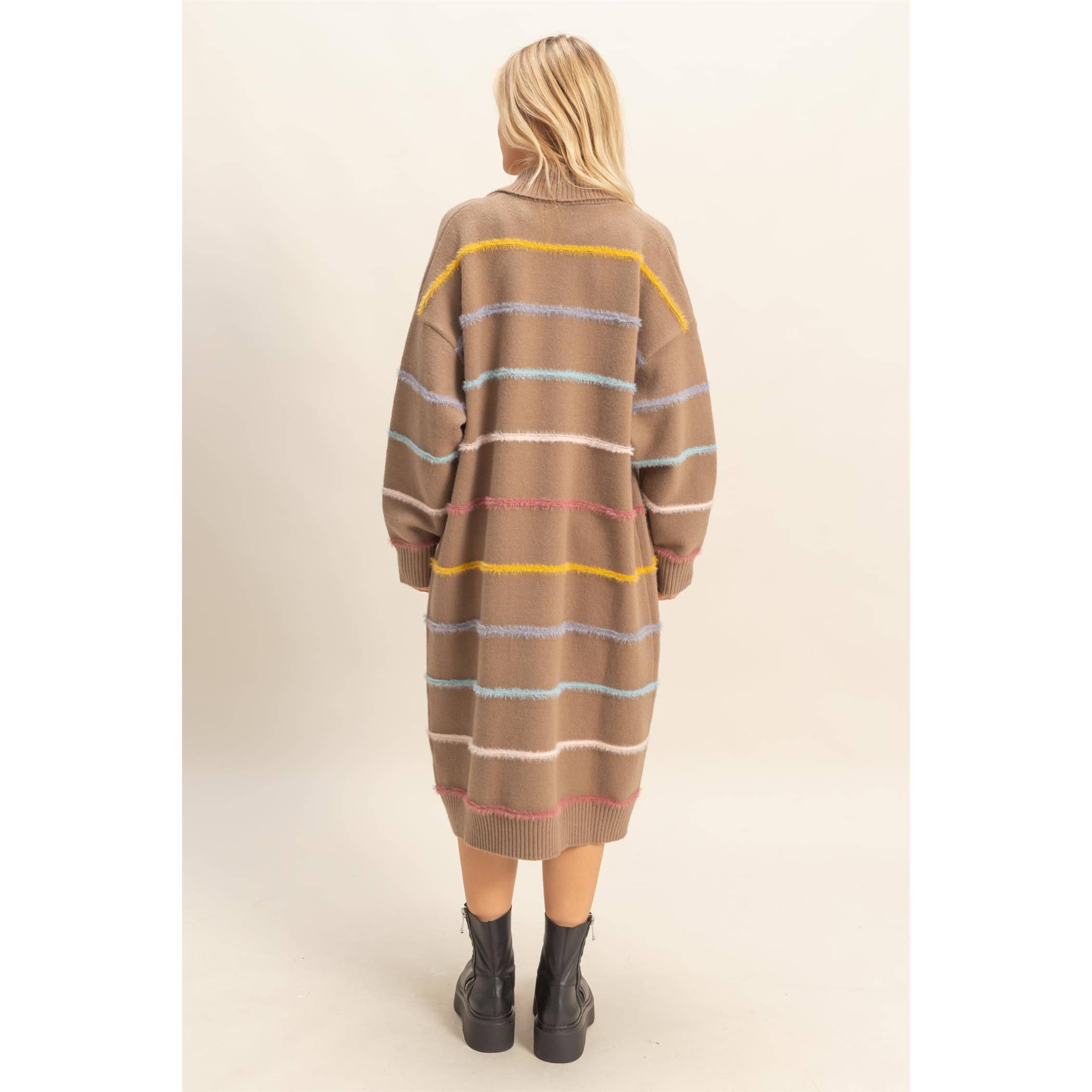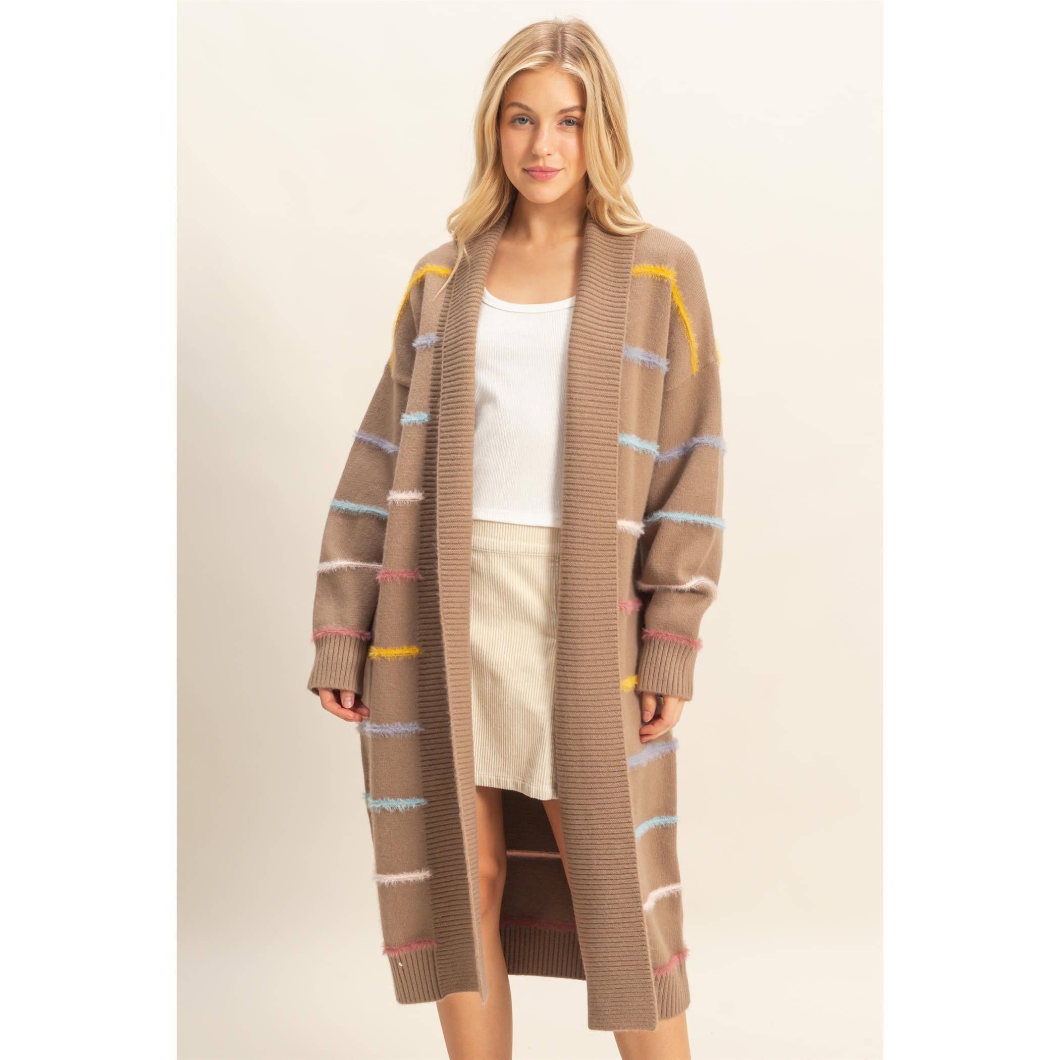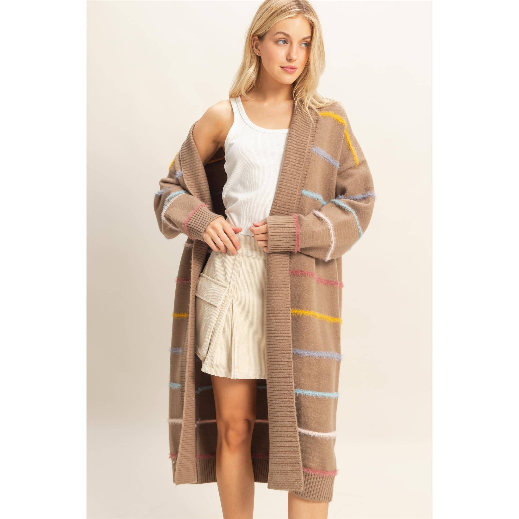 Elevate your wardrobe with the Mocha Striped Long Cardigan, a versatile layering piece that does it all. This relaxed longline cardigan boasts an open front and understated multicolor stripes that create beautiful movement with every wear. The generous drape transitions seamlessly from cozy nights at home to stylish outdoor adventures. Layer it over fitted jeans or trousers for a perfectly proportioned look. Designed in the USA and imported.