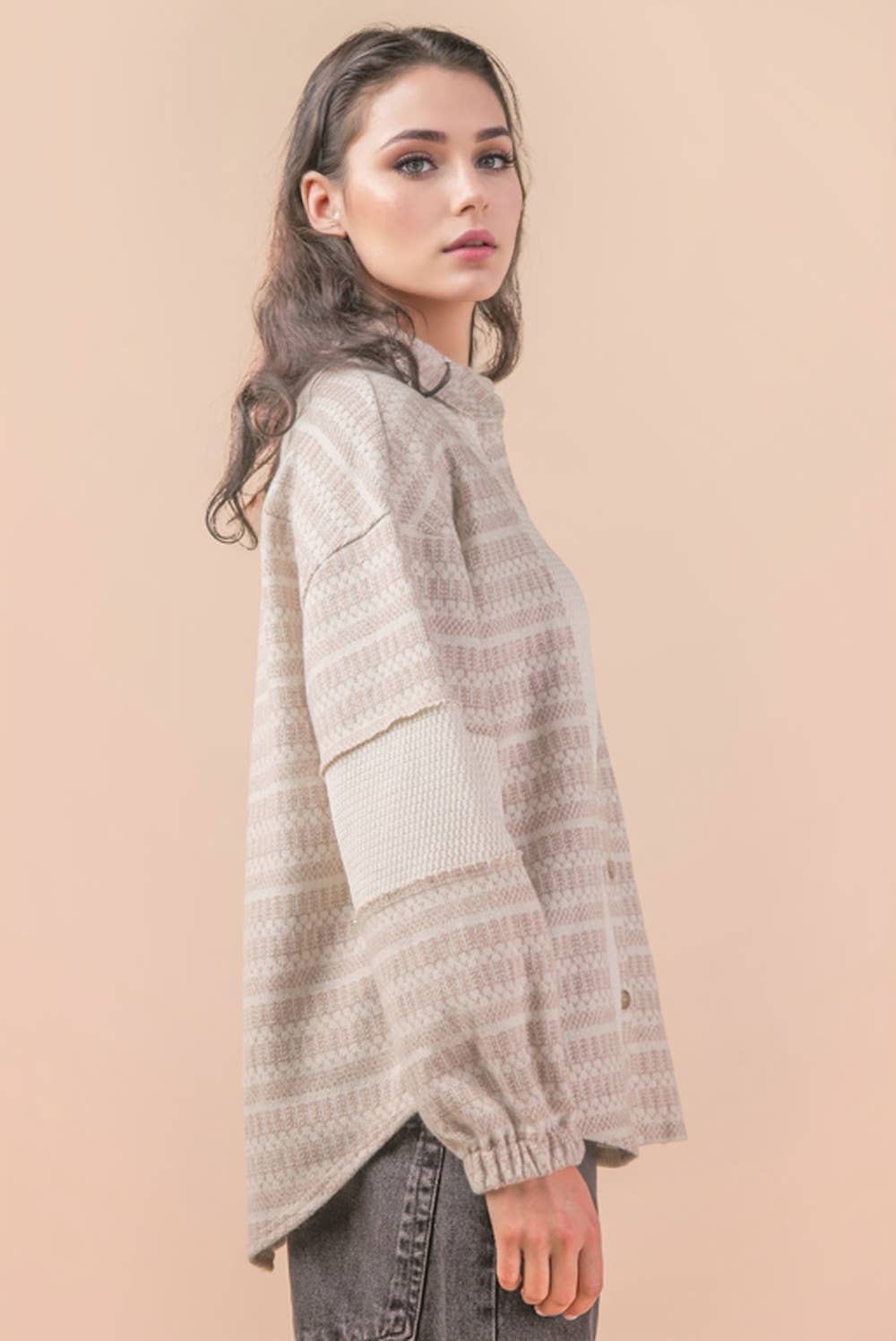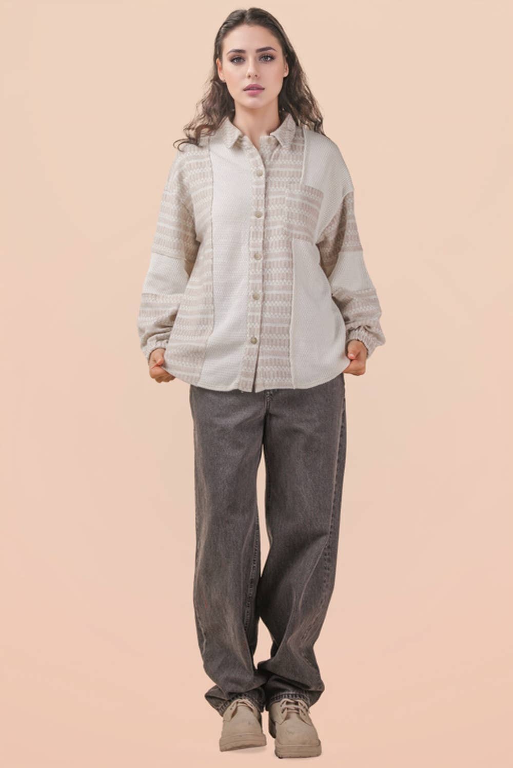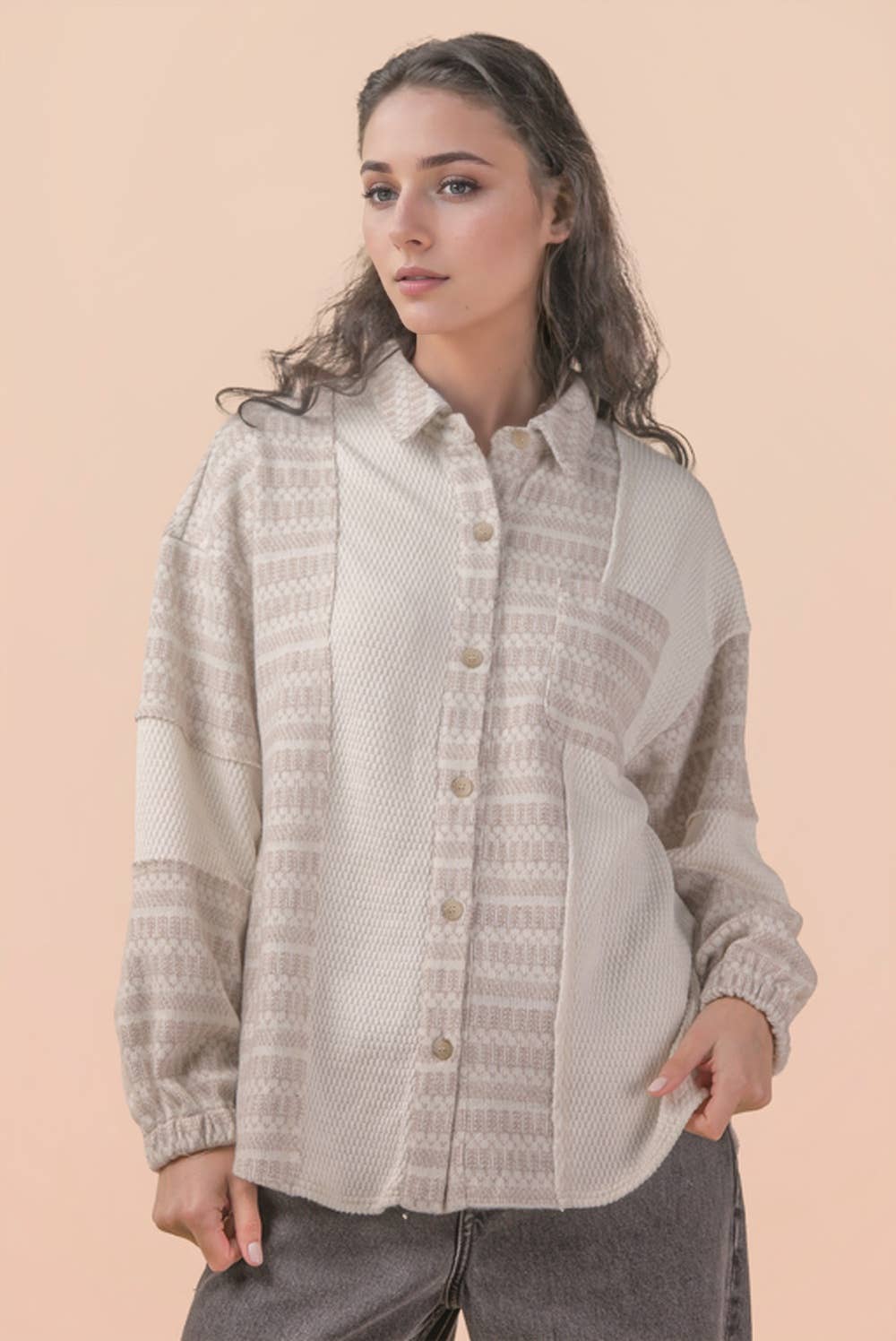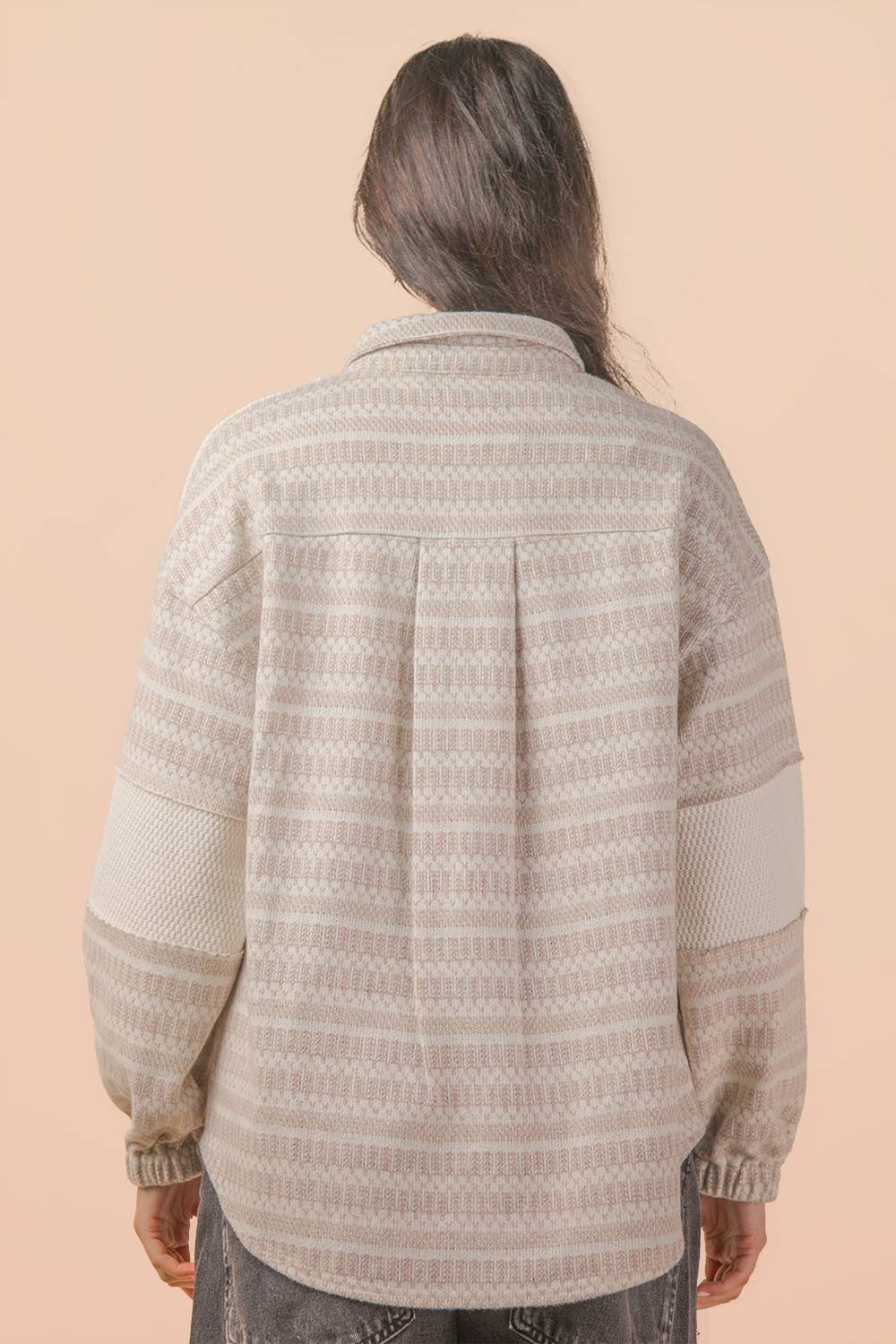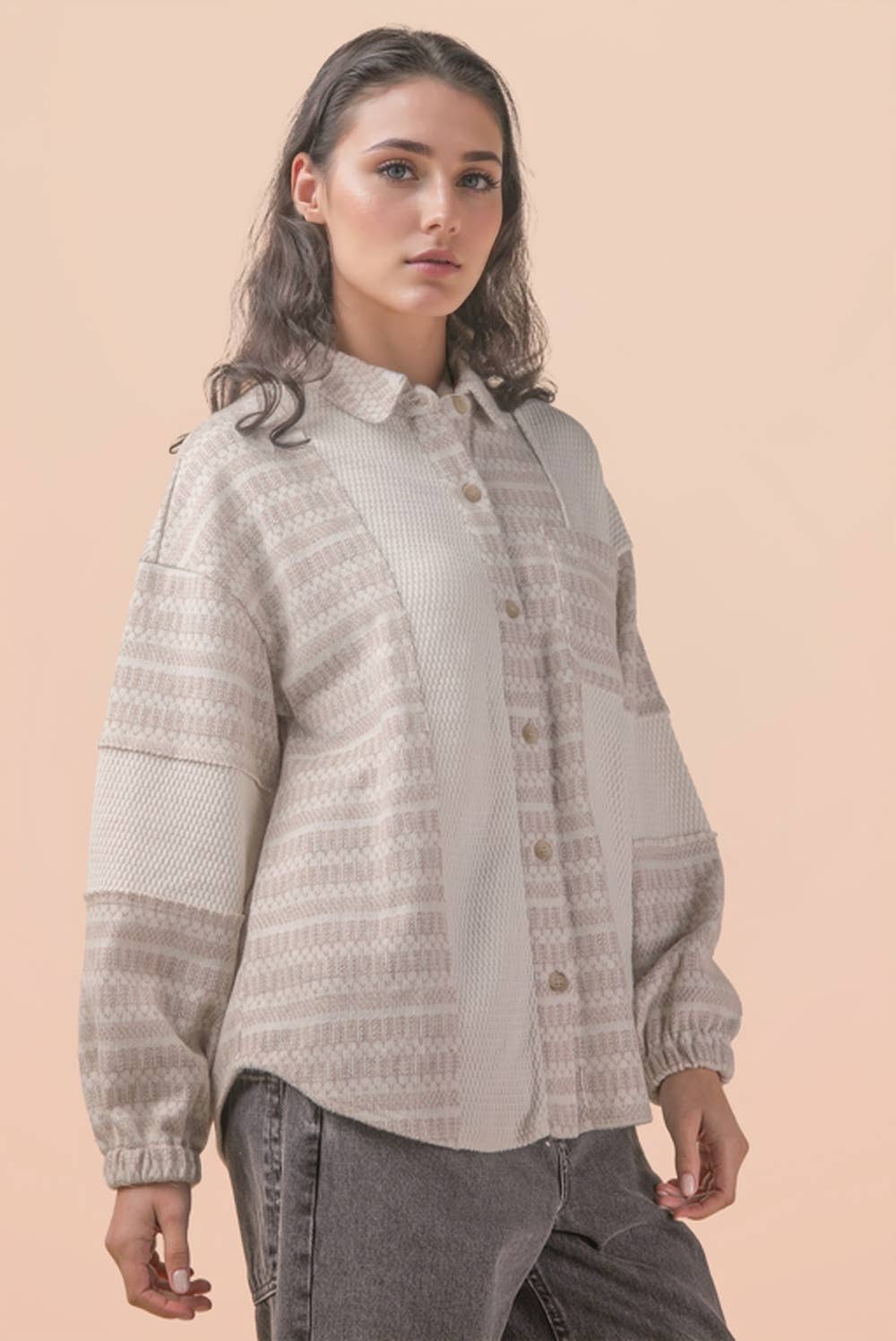 Layer up with the Jenny Casual Shacket, your new go-to for effortless style. This oversized mixed-knit jacket features a relaxed drop shoulder silhouette and button-down front for easy layering. Practical patch pockets keep your essentials close, while the rounded hem adds a modern touch. Crafted from a breathable poly-viscose blend, it's the perfect piece to throw on when you want cozy comfort without trying too hard.