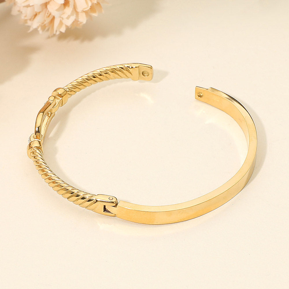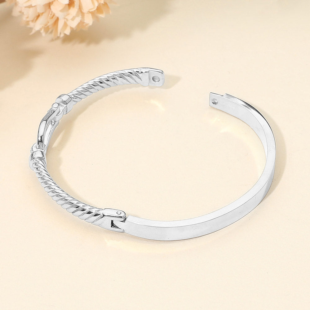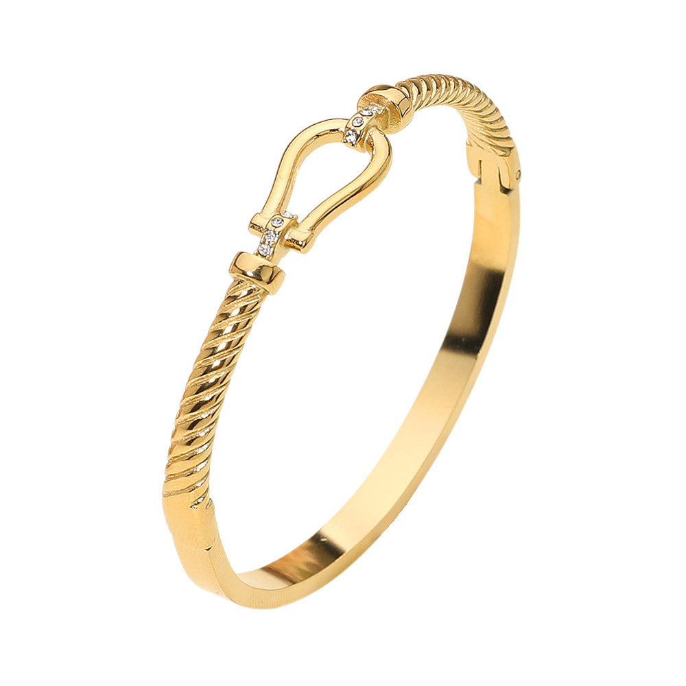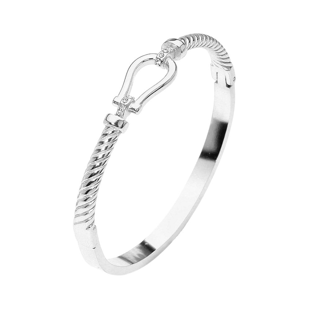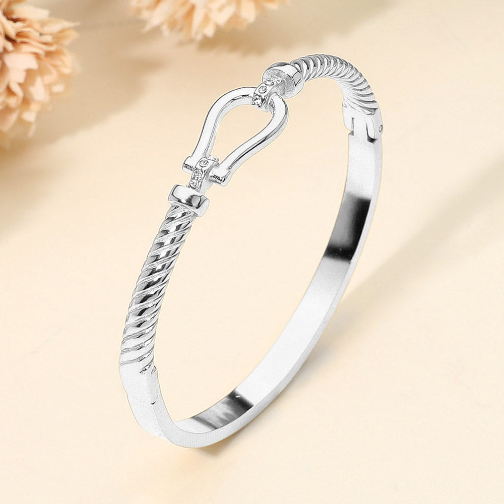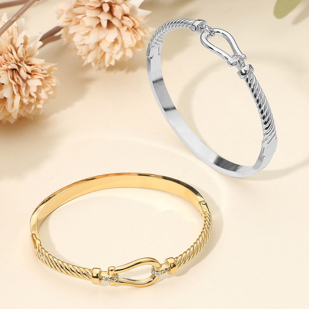 Unlock your accessory game with this stunning stainless steel bangle bracelet! Featuring a chic textured design and an eye-catching Horsebit buckle accent with polished finish, this hinged beauty transitions seamlessly from casual to formal. Water-resistant and hypoallergenic, it's lead and nickel compliant—so you can wear it worry-free. A sophisticated twist on everyday elegance that keeps giving, day after day.