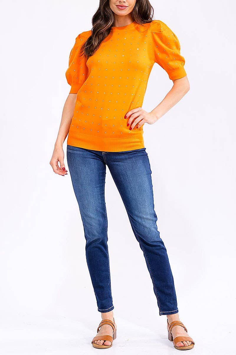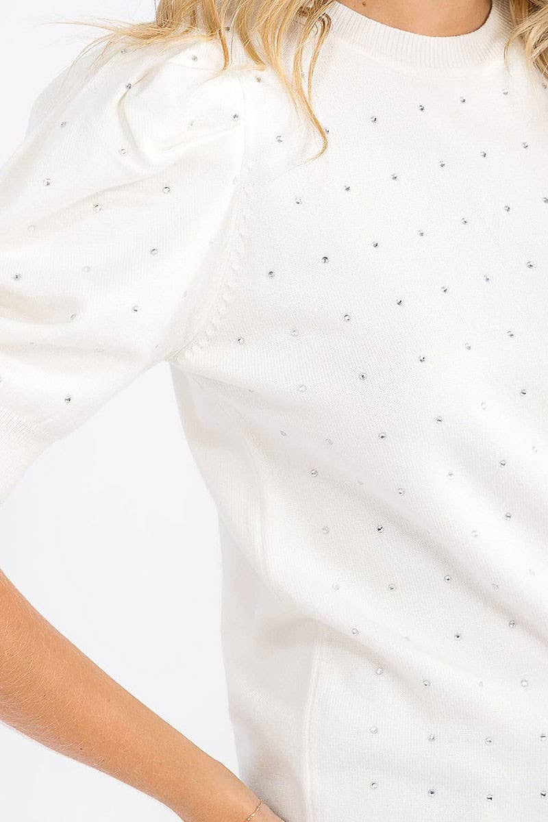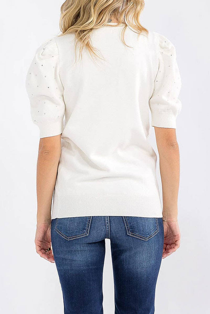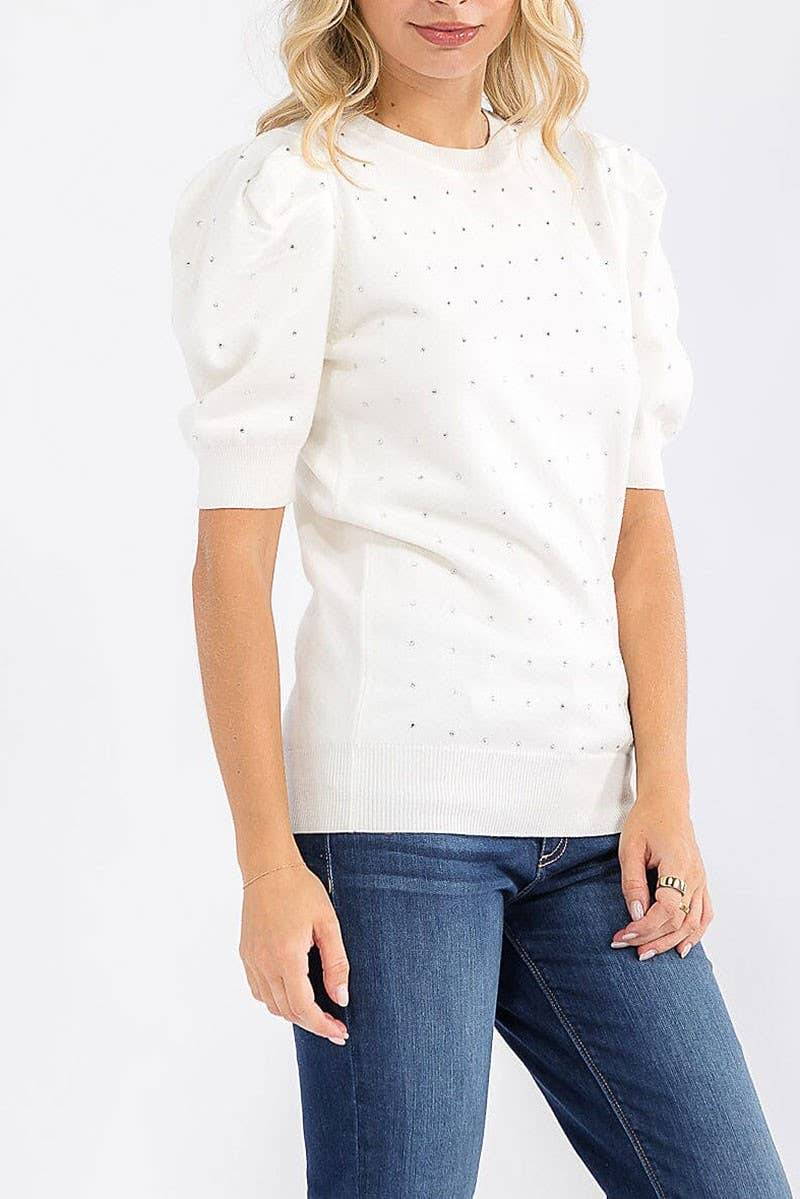 Elevate your everyday style with this playful puff sleeve blouse featuring eye-catching stud details. Crafted from a luxurious viscose-blend fabric (48% viscose, 27% polyester, 25% nylon), it offers a soft drape with just the right amount of structure. The short puff sleeves add a flirty touch, while the studded embellishments bring an edgy-chic vibe. Perfect for dressing up basics or standing out at casual gatherings. Hand wash to maintain its pristine quality and keep those studs sparkling.. * Model is wearing size S Length: 26" Bust: 34" Waist: 18".