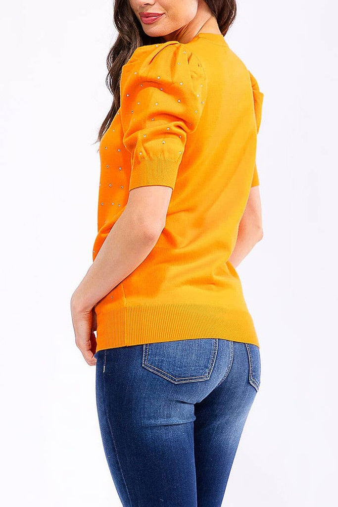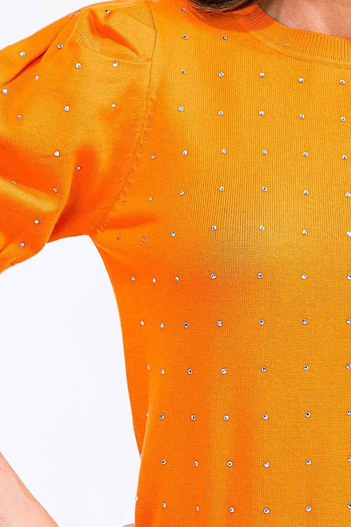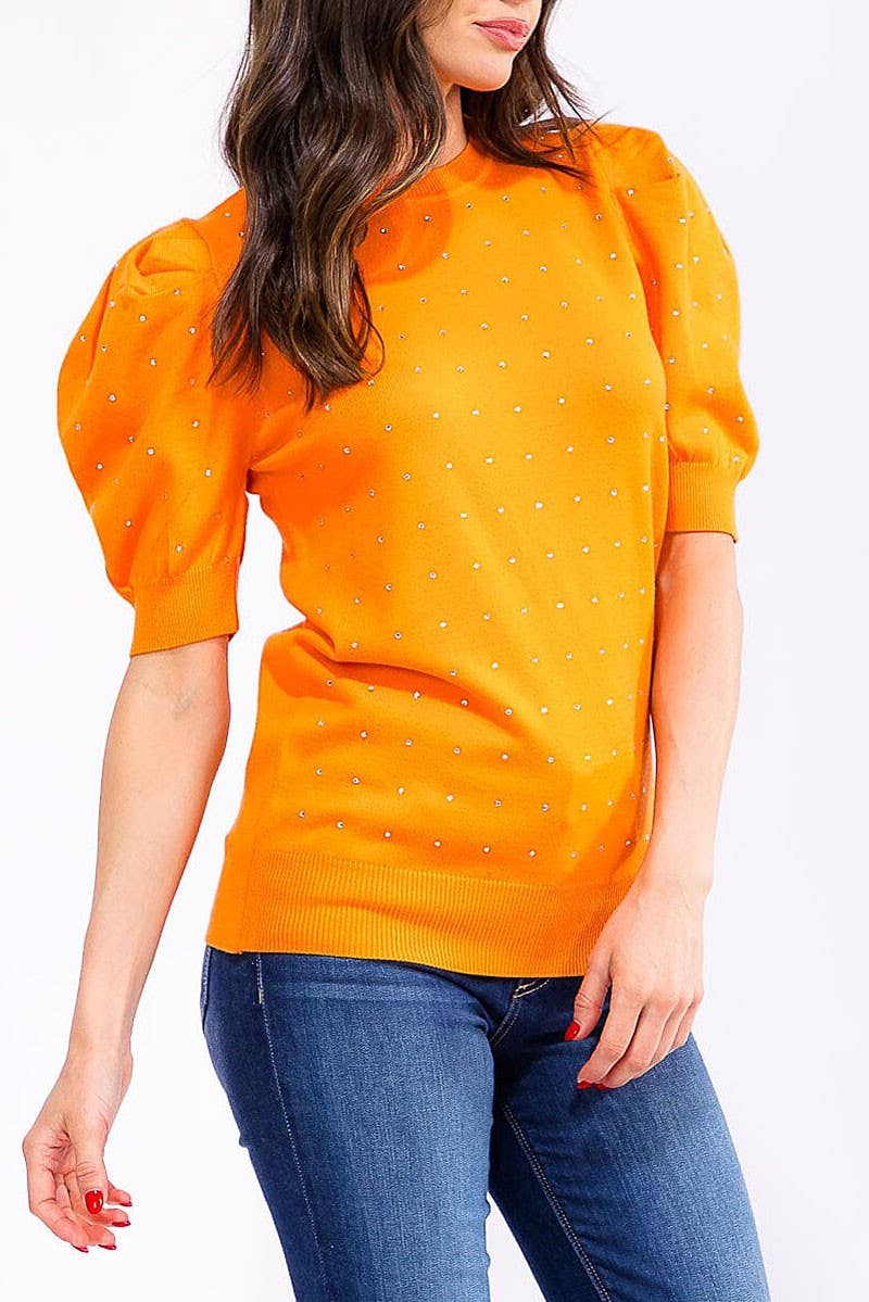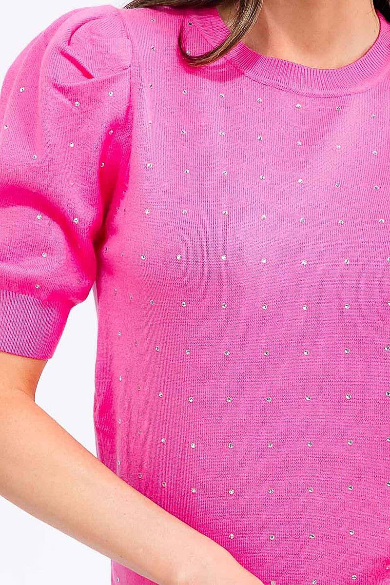 Elevate your everyday style with this playful puff sleeve blouse featuring eye-catching stud details. Crafted from a luxurious viscose-blend fabric (48% viscose, 27% polyester, 25% nylon), it offers a soft drape with just the right amount of structure. The short puff sleeves add a flirty touch, while the studded embellishments bring an edgy-chic vibe. Perfect for dressing up basics or standing out at casual gatherings. Hand wash to maintain its pristine quality and keep those studs sparkling.. * Model is wearing size S Length: 26" Bust: 34" Waist: 18".