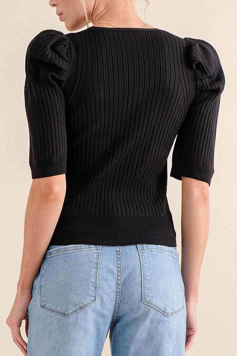 The Emily Puff Sleeve Blouse in Black is a delightful wardrobe staple that combines elegance with playful charm. This sophisticated piece features short puff sleeves and a flattering V-neckline, while ribbed detailing adds texture and visual interest. Crafted from 100% nylon, it's lightweight and easy to care for—just hand wash and you're good to go. With a 20" length, 28" bust, and 14" waist, it's tailored for a polished fit. Made in China, this versatile blouse pairs beautifully with everything from skirts to trousers for endless styling possibilities.