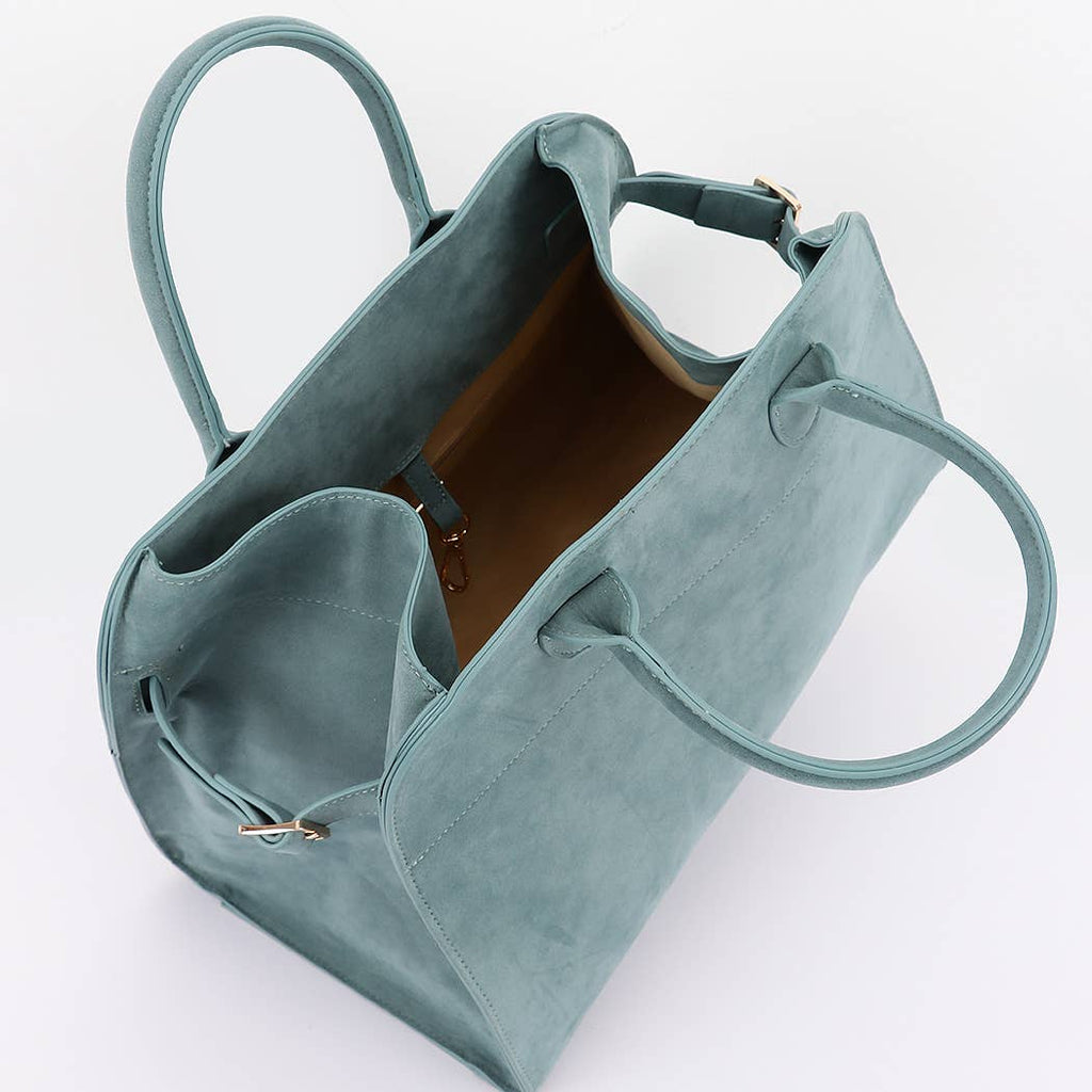 * Faux Suede Tote Bag * 15.5W*11H*9D * Polyurethane,Mixed Metal. * This Faux Suede Tote Bag  features a soft, faux - suede exterior with dual top handles and a side buckle detail. Its spacious, structured design offers ample room for daily essentials, combining comfort and style.