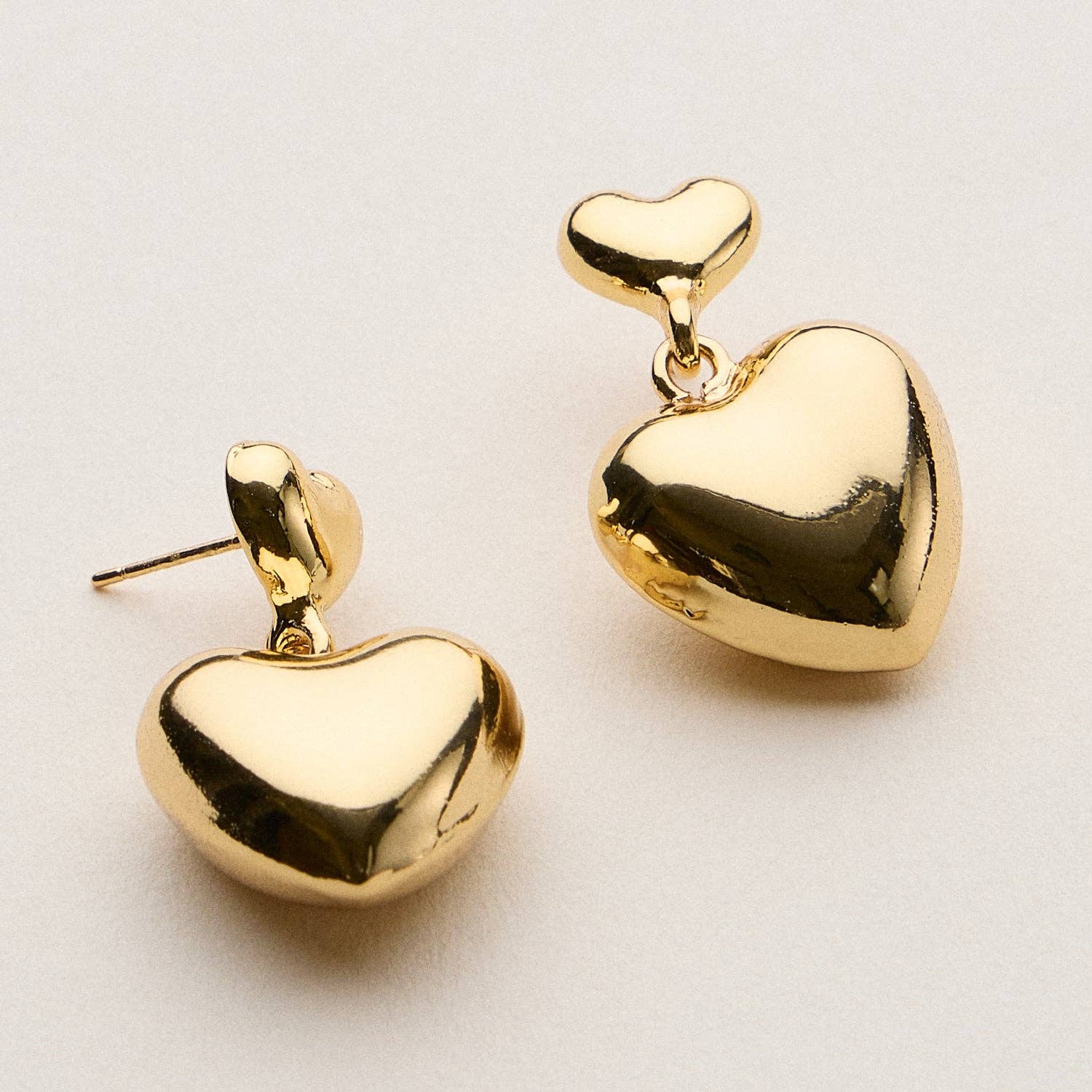 Fall in love with these 18K gold dipped double heart drop earrings. Featuring a dainty heart stud with a larger, puffy heart charm that swings below, these earrings add playful movement and bold shine to your look. Their smooth, high-polish finish and romantic design make them perfect for gifting, date nights, or everyday wear with a sweet twist. Lightweight yet eye-catching, these heart earrings are a stylish expression of love and charm.