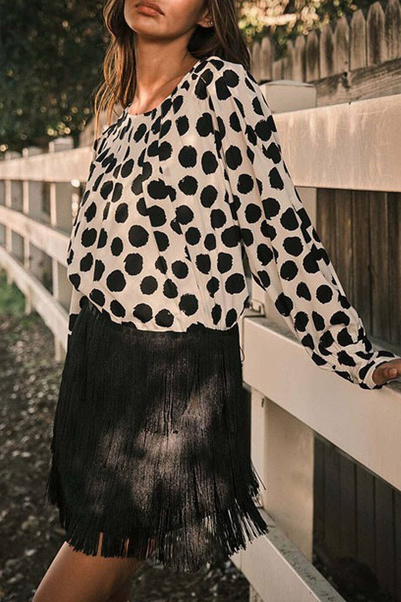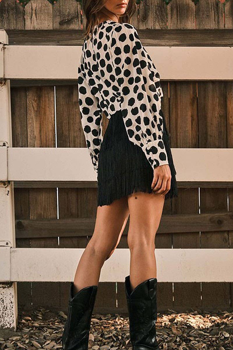 Mini skirt with tiered fringe and elastic waist. Hand wash only.