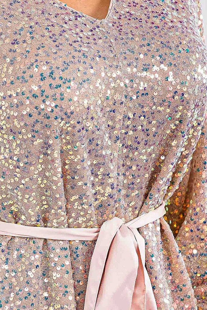 Sparkle and shine in this champagne sequin romper! Featuring a flattering v-neck, long sleeves, and a self-tie waist, it's perfect for nights out or special occasions. The all-over sequin detailing catches the light beautifully. Hand wash to keep it looking fabulous.