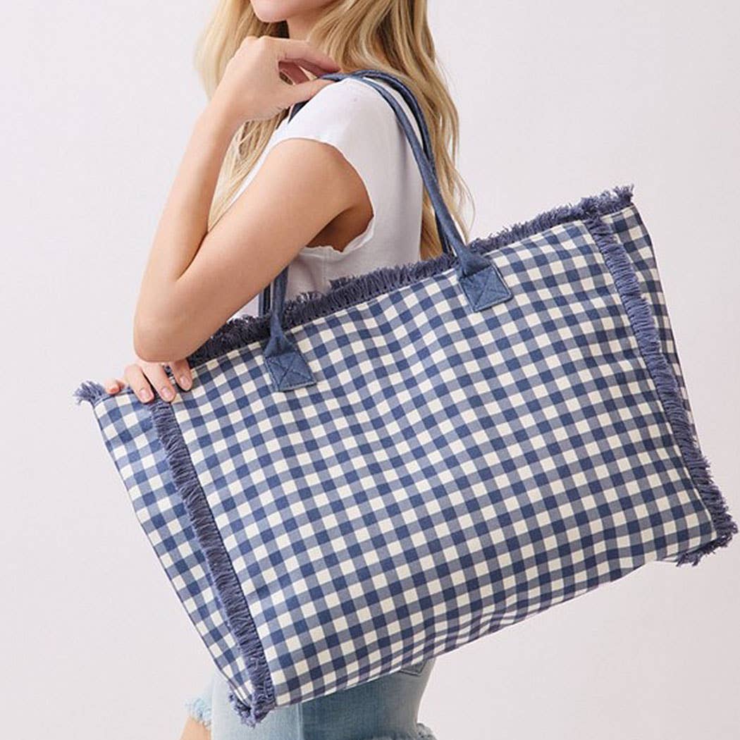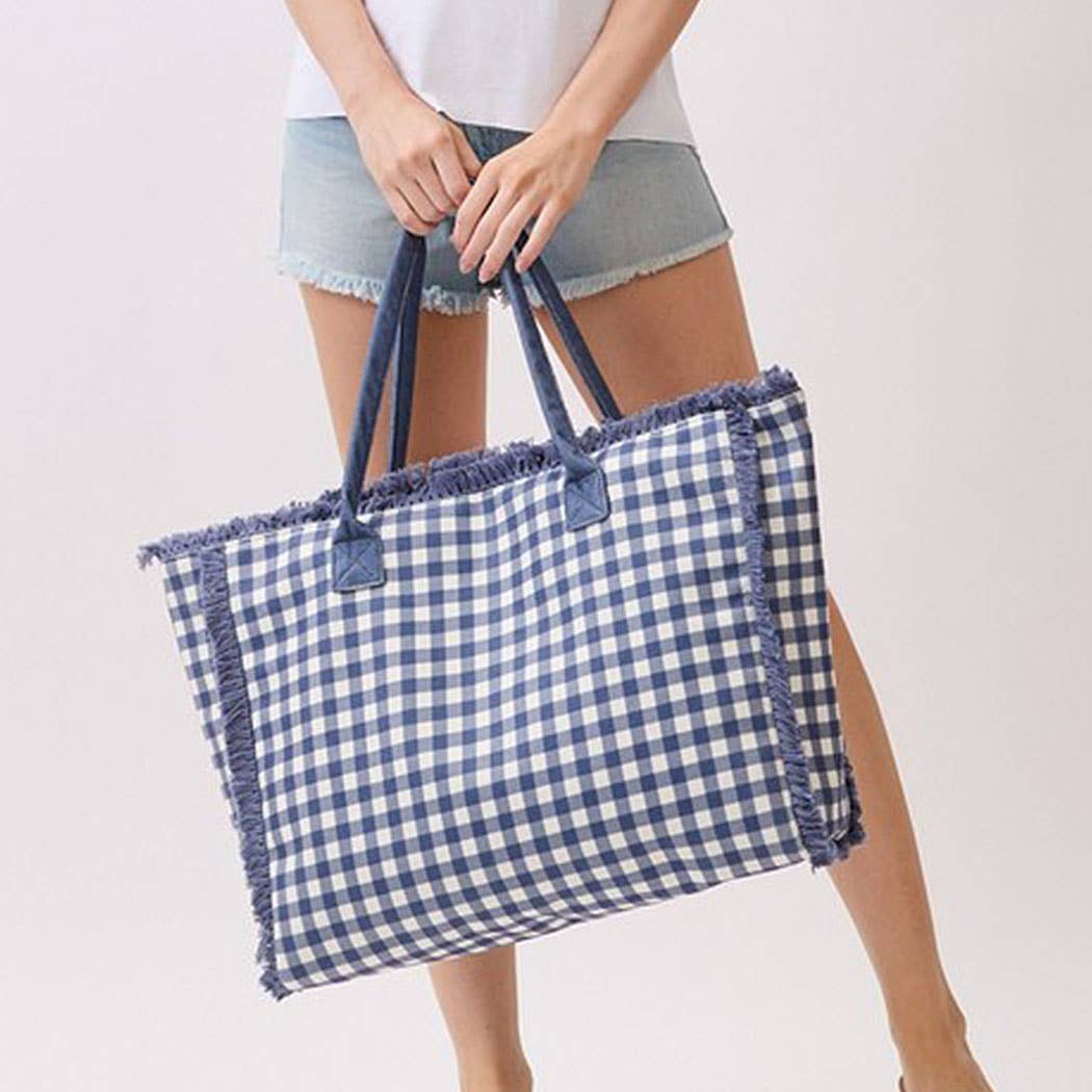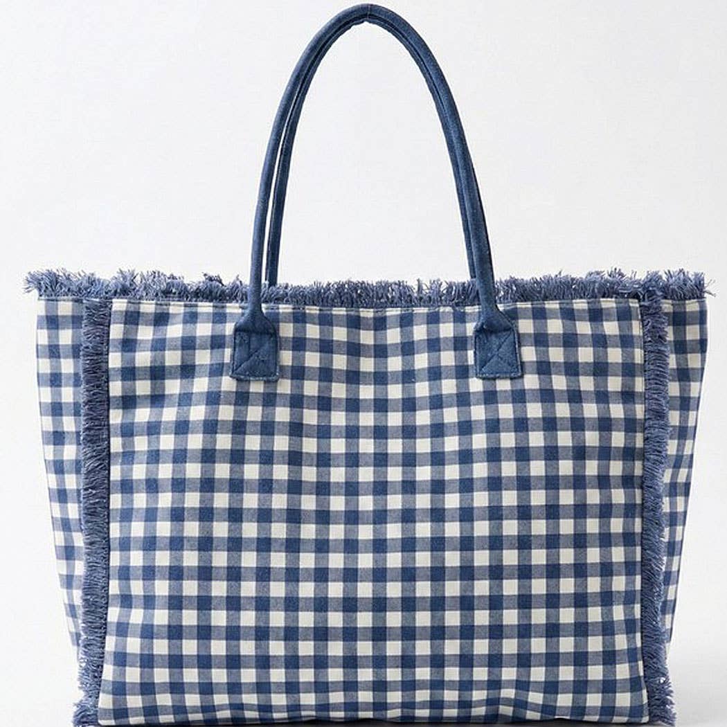 Grab this navy gingham tote and you're ready for anything! Soft terry cloth hugs a timeless gingham check design, while charming frayed edges add a touch of carefree cool. Measuring 22.5"x14"x5", it's built tough for all your warm-weather escapades. Reliable handles keep everything secure, and the spacious interior swallows sunscreen, snacks, and sundresses without breaking a sweat. Perfect for poolside hangs, casual brunches, or lazy beach days—this playful bag pairs practicality with undeniable charm.