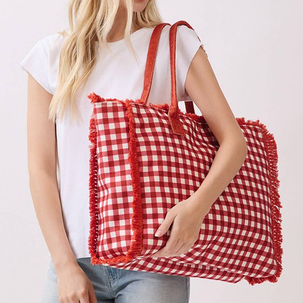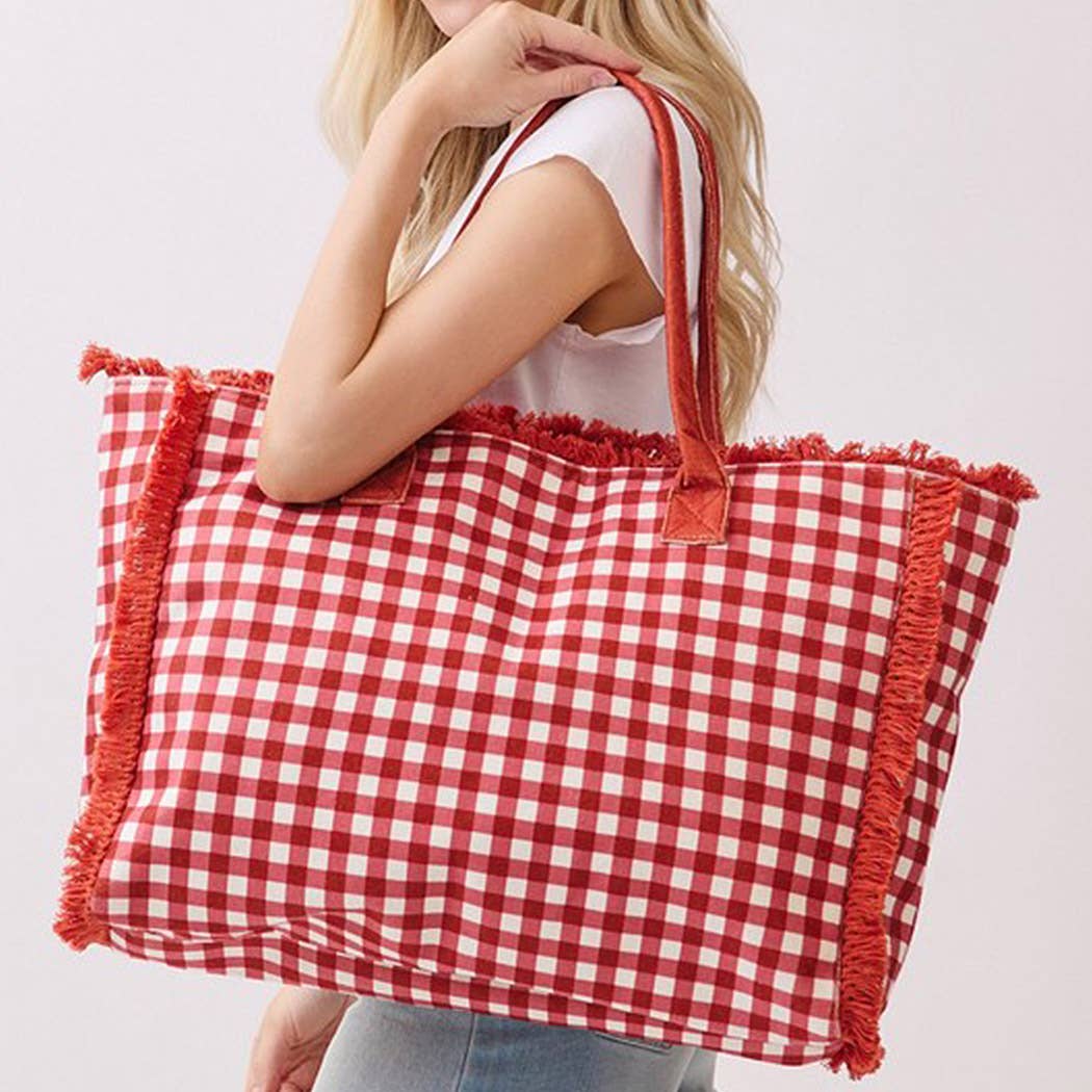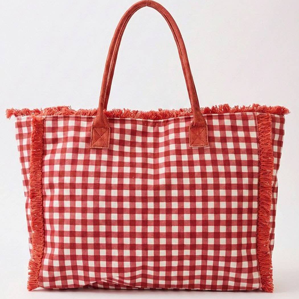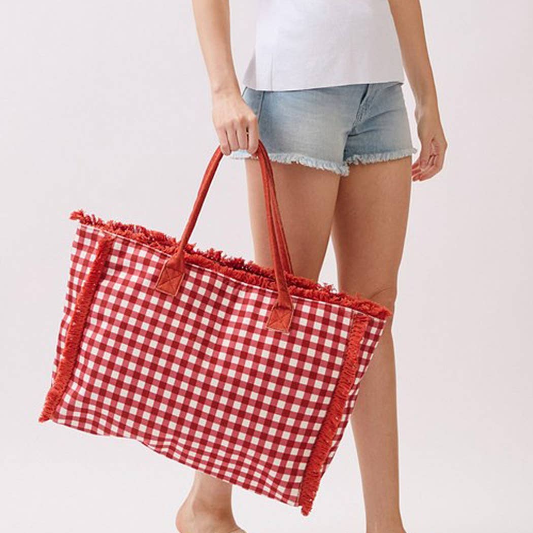 Meet your new go-to bag for warm-weather fun! This gingham check tote features soft, cozy terry cloth in a timeless red pattern, complete with charming frayed edges that add character. Measuring 22.5"x14"x5", it's built to handle whatever you throw at it—think poolside lounging, brunch dates, or spontaneous beach trips. The sturdy handles make carrying a breeze, while the roomy interior keeps all your gear organized. Perfect for anyone who refuses to sacrifice style for practicality!