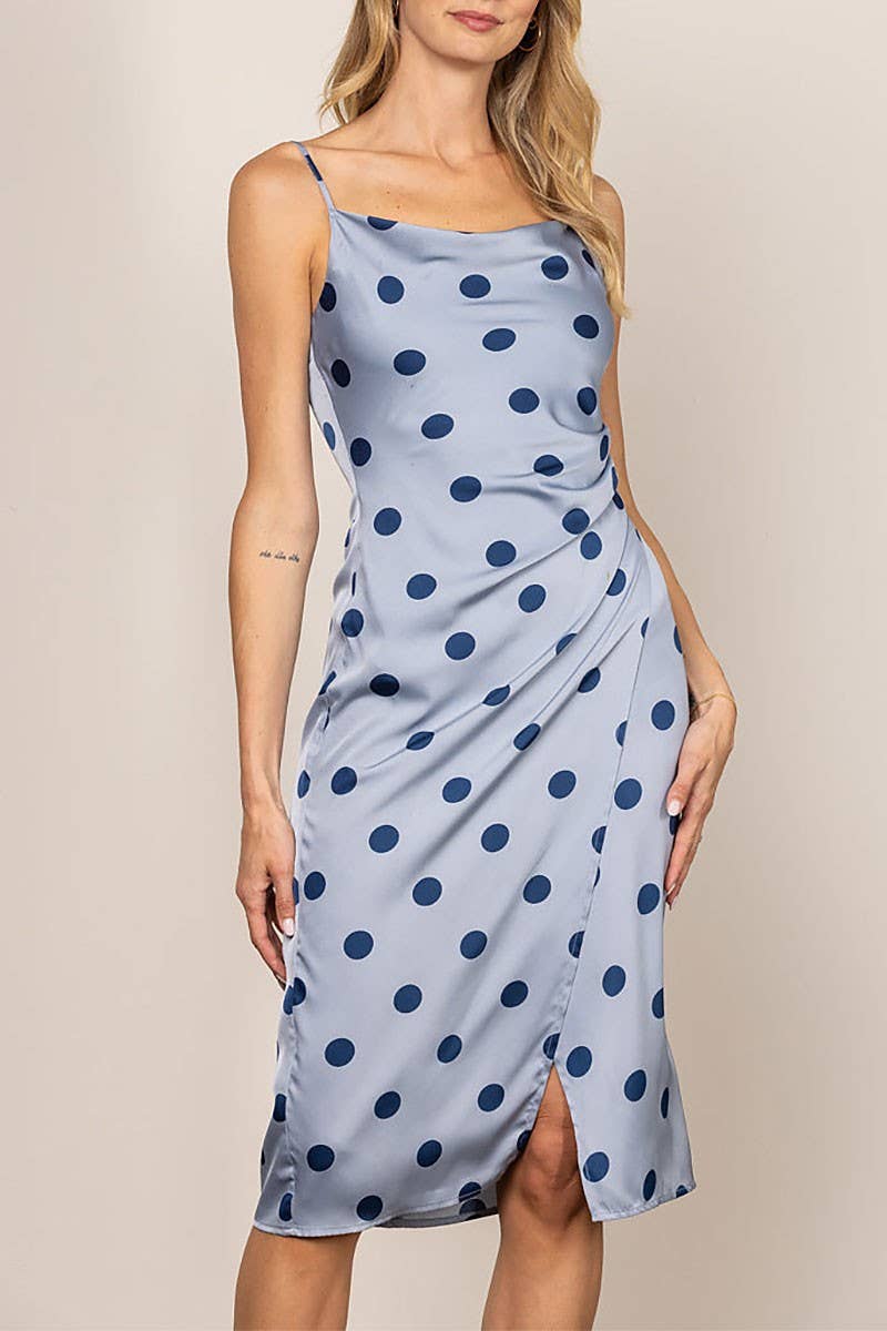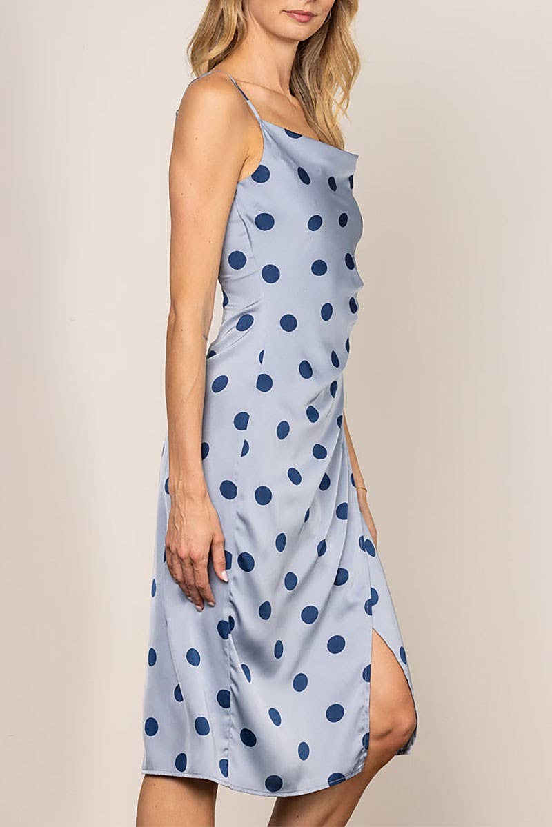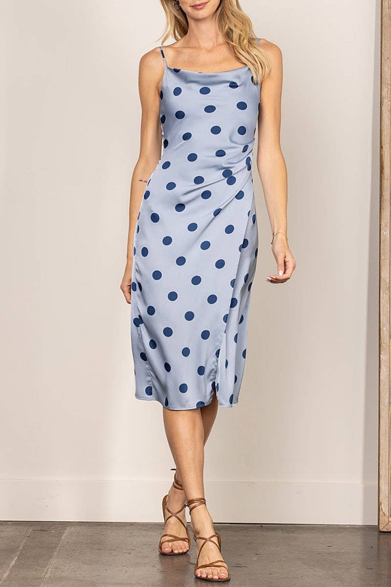 Elevate your warm-weather wardrobe with the Serena Midi Dress, a playful polka dot design on a sleek silhouette. Featuring delicate spaghetti straps and a chic slit hem, this dress balances feminine charm with modern style. It's the perfect piece for spring and summer occasions!