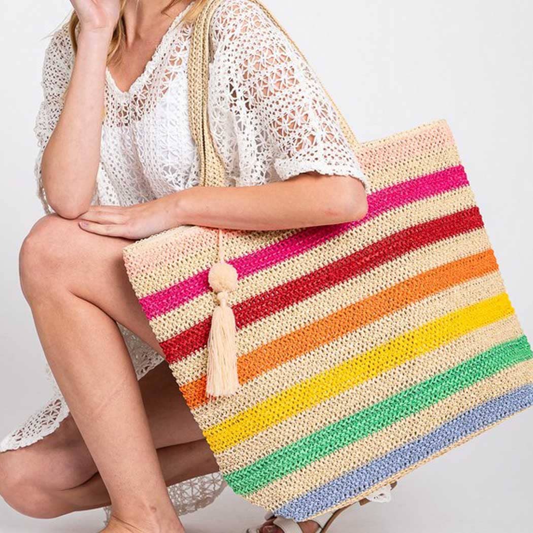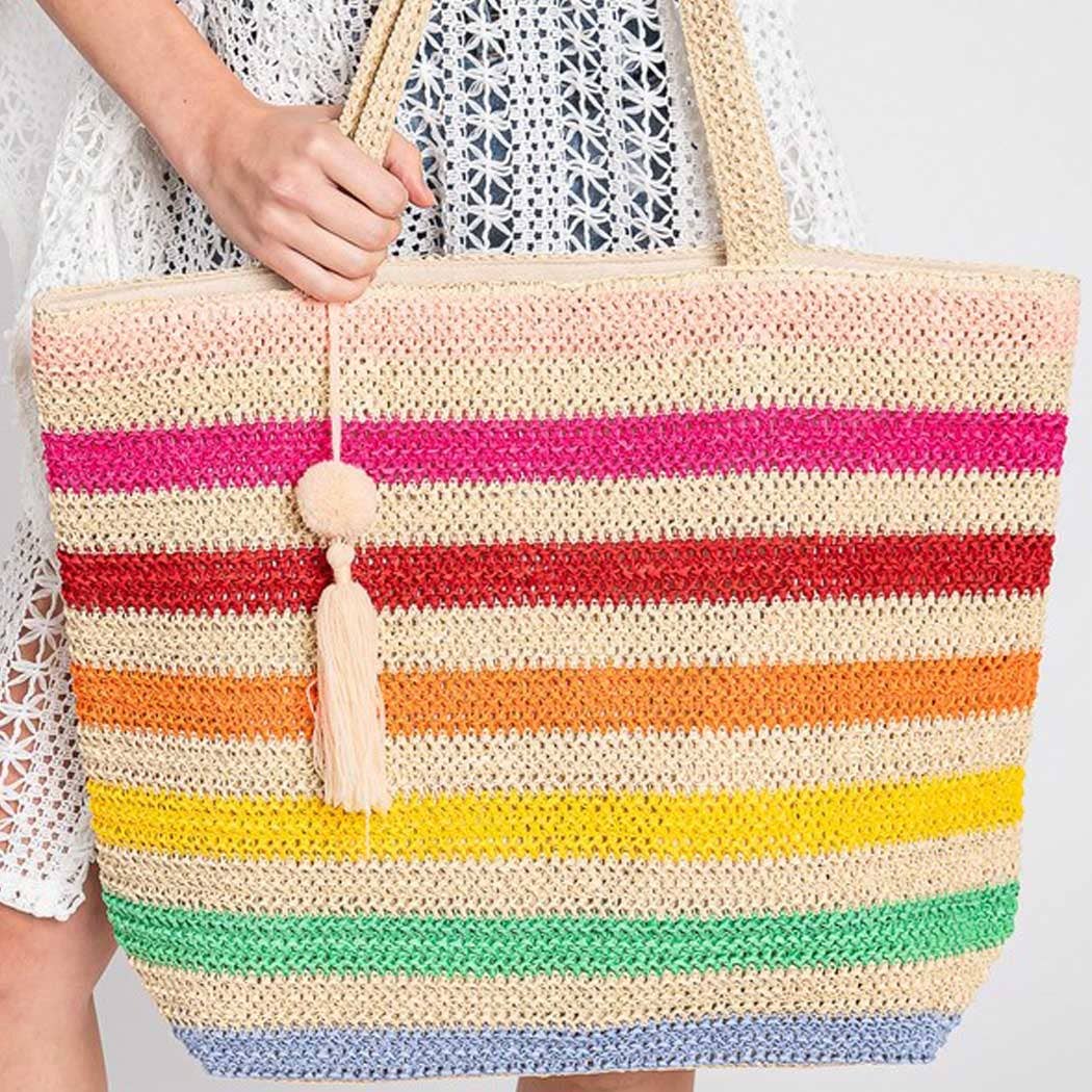 Carry your essentials in style with this cheerful crocheted tote! Featuring vibrant multi-color stripes and playful pom pom tassels, it's the perfect companion for beach days, farmers markets, or weekend adventures. This lightweight bag measures 20"x15"x5.5" and offers plenty of room without the bulk. Whether you're stashing sunglasses, snacks, or summer reads, this fun striped beauty keeps everything organized while adding a pop of personality to any outfit.