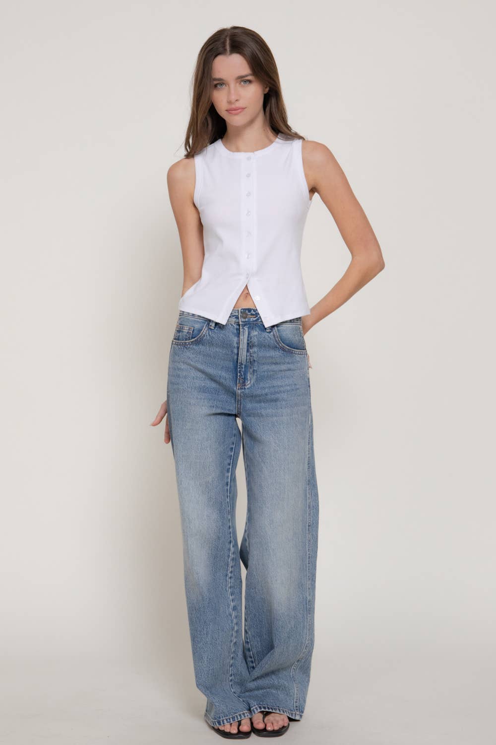 Effortless elegance meets everyday versatility with the Noa Button Down in crisp white. This sleeveless crew neck silhouette features a structured 1x1 rib knit that flatters and moves with you. Crafted from a breathable cotton-spandex blend, it's the perfect layering piece for spring and summer—dress it up with tailored trousers or keep it casual with your favorite denim. A modern essential that transitions seamlessly from office to weekend.
