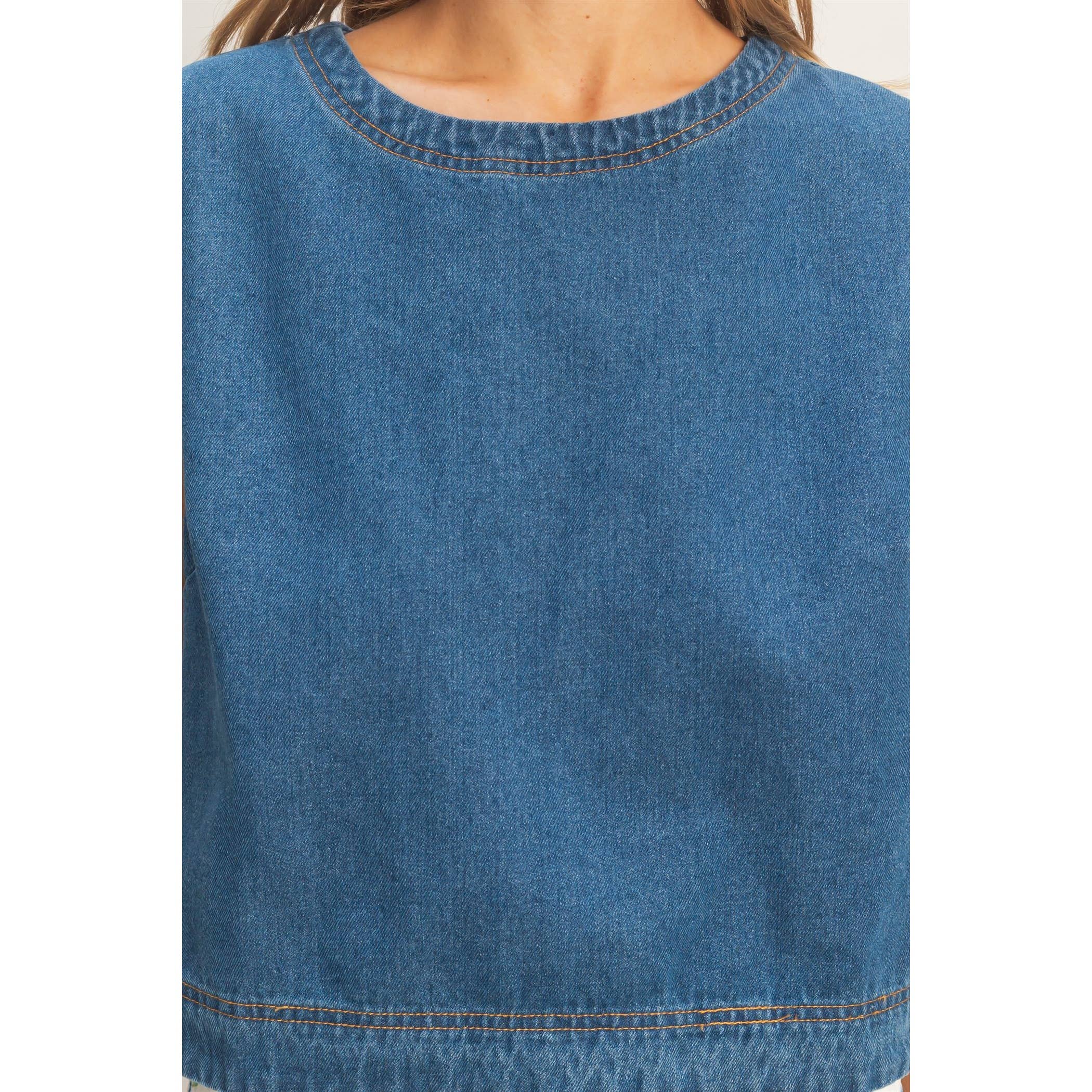 Meet the Shiloh Denim Top in classic blue—the laid-back essential you didn't know you needed. This sleeveless beauty boasts a relaxed fit with a crew neck and enzyme-washed softness that hugs your skin just right. Streamlined armholes and a straight hem give it that effortlessly polished edge. Style it with crisp tailored shorts for a sophisticated lunch look, or dress it down with your favorite high-waisted jeans for weekend vibes. Made from a breathable cotton, polyester, and rayon blend, this USA-designed import is built to be your go-to piece season after season.